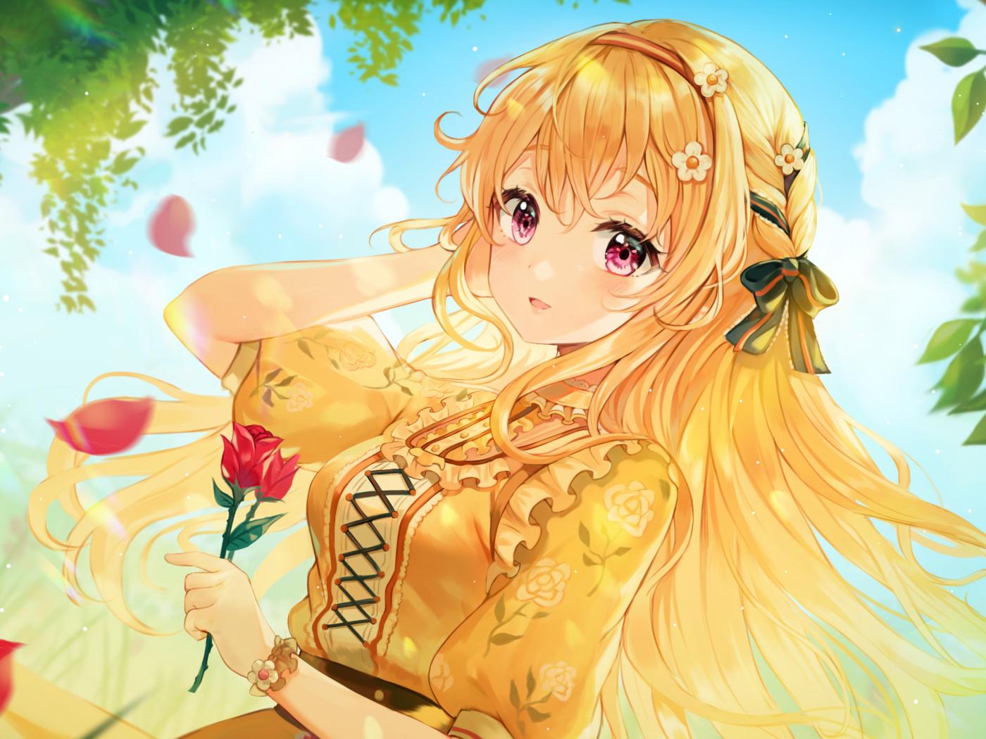 Wallpaper Beautiful red-haired anime girl with a rose in hand