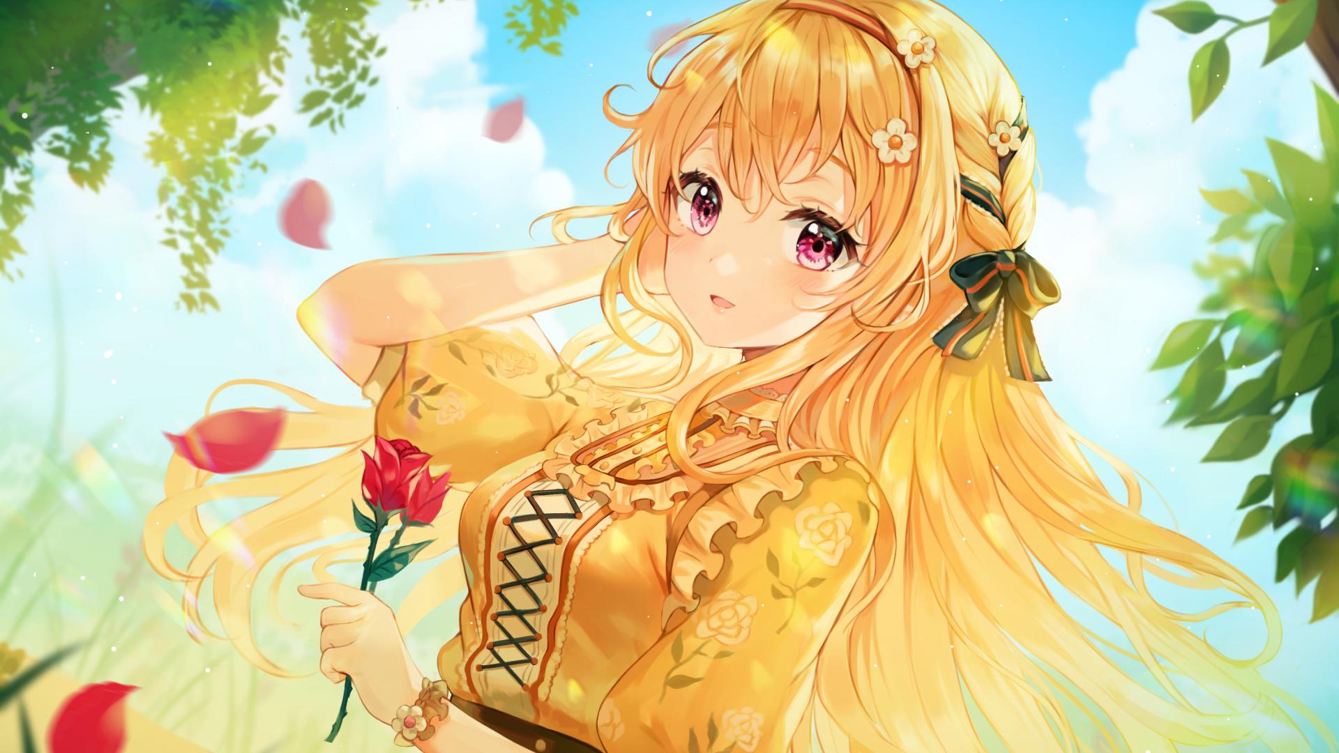 Wallpaper Beautiful red-haired anime girl with a rose in hand