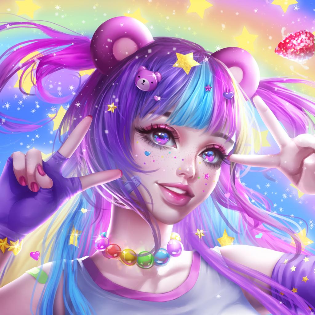OmG so cute, i wuv her cotton candy hairstyle. Purple lipstick and the stars on the jewelry are adorable. Strawberry cheesecake pika pika.