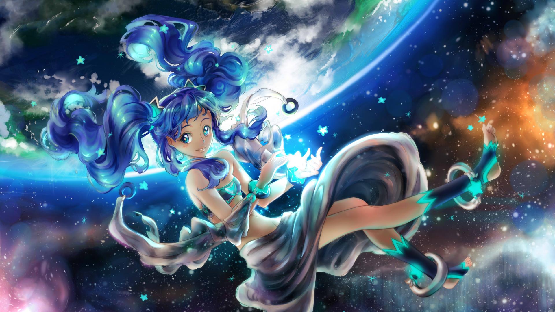 Wallpaper Anime girl with blue hair soars in the air