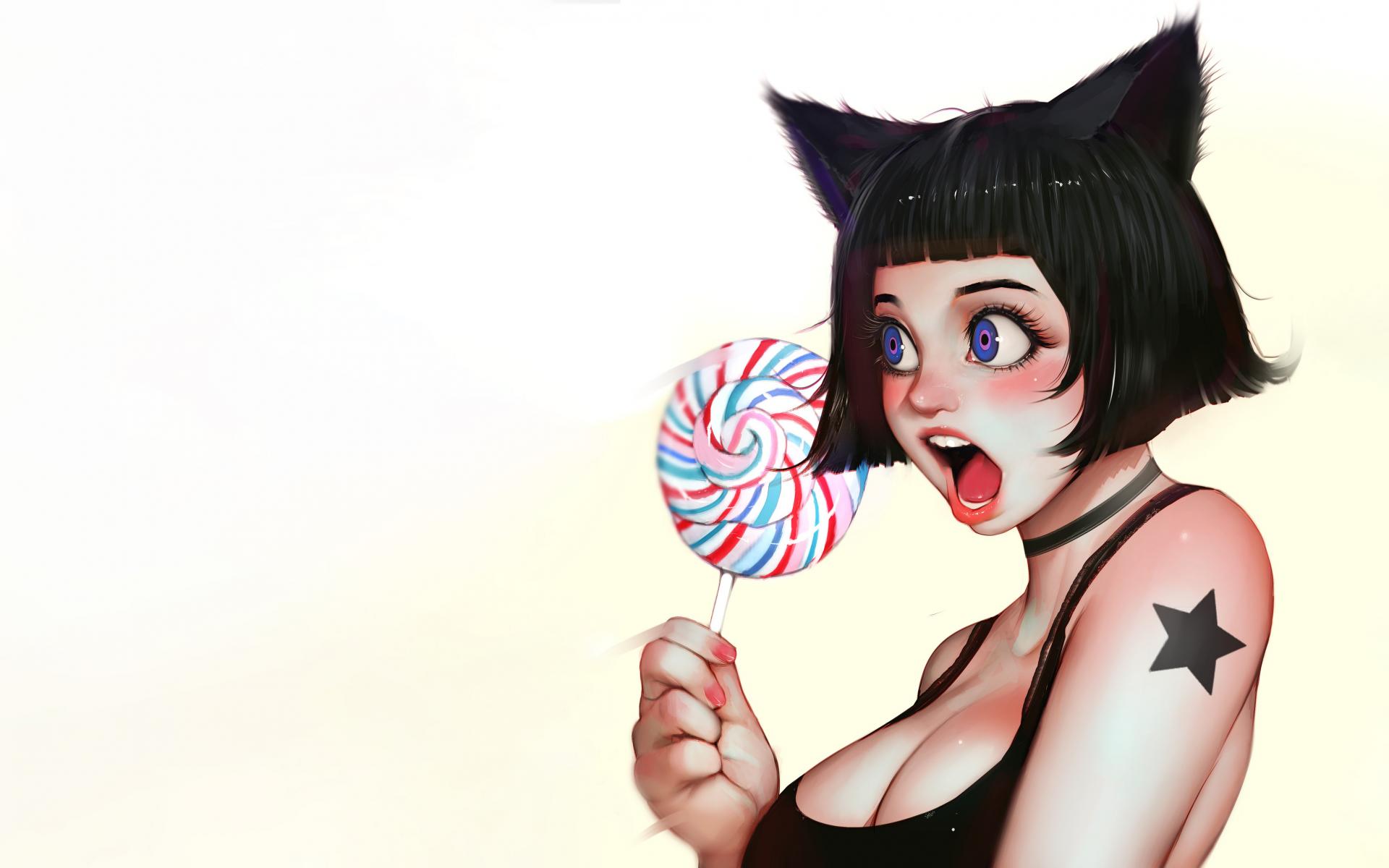 Wallpaper Anime girl with candy in hand on white background