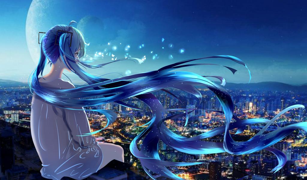Wallpaper Anime girl with long blue hair sitting on the roof