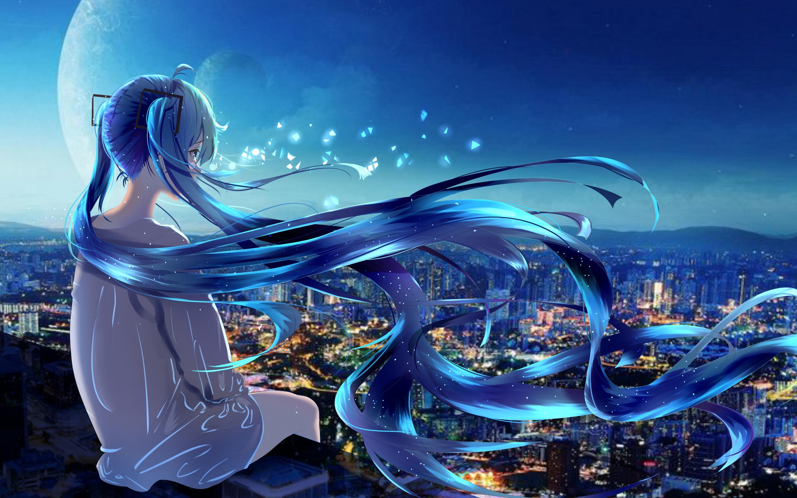 Wallpaper Anime girl with long blue hair sitting on the roof