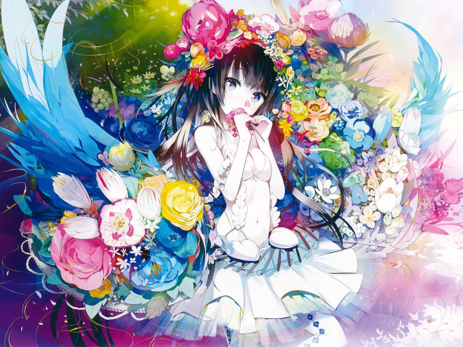 Wallpaper Beautiful anime girl with a bouquet of flowers in her hands