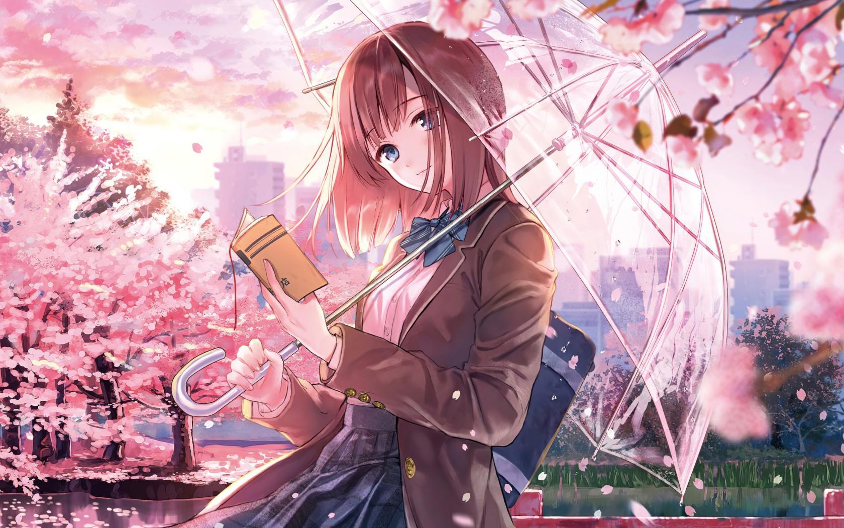Wallpaper Anime girl with a book and an umbrella in hand
