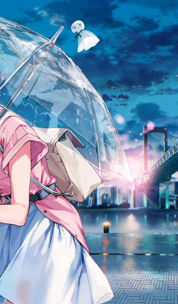 Wallpaper Anime girl with umbrella on the bridge