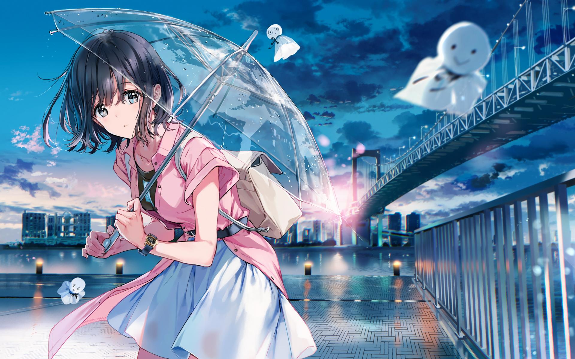 Wallpaper Anime girl with umbrella on the bridge