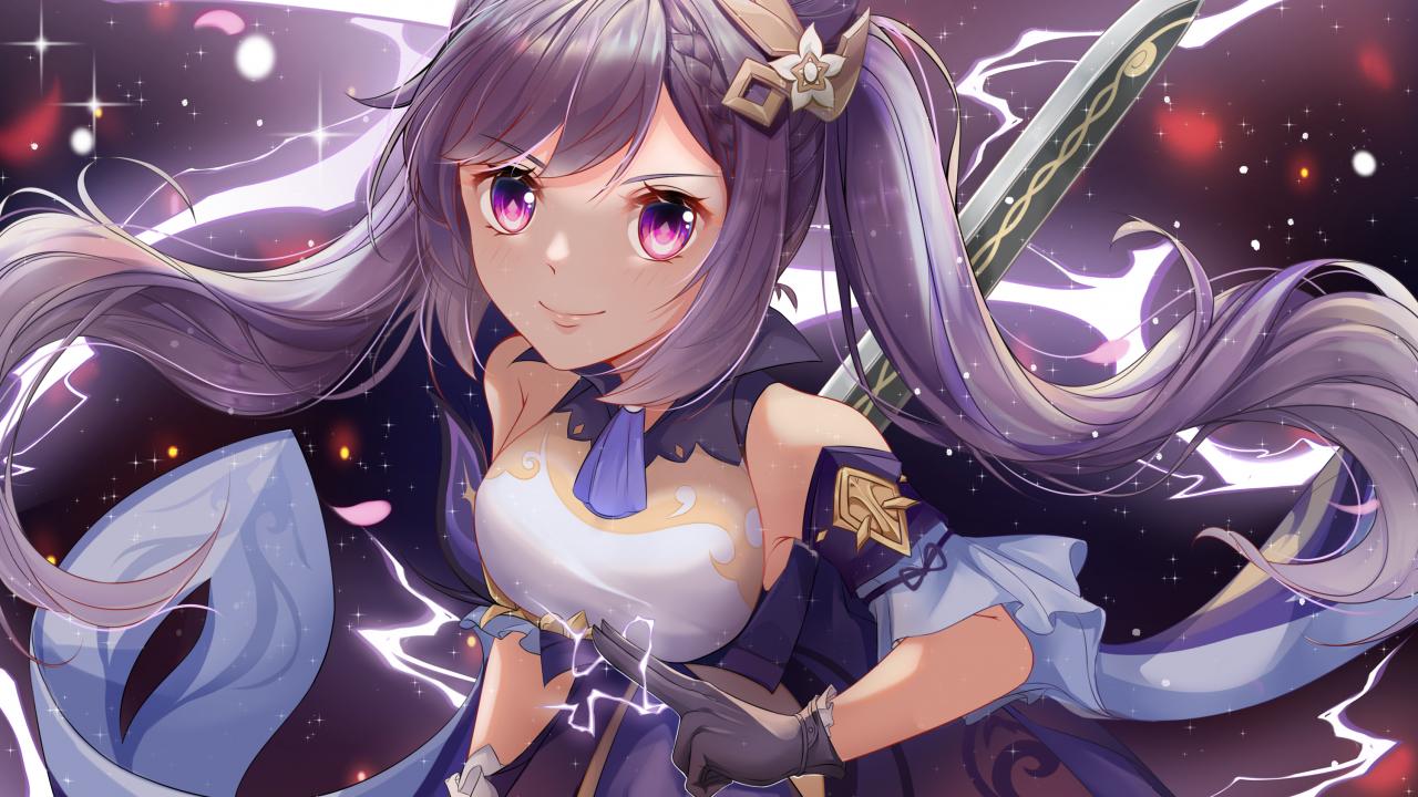 Wallpaper Anime girl with lilac hair and a sword in his hands