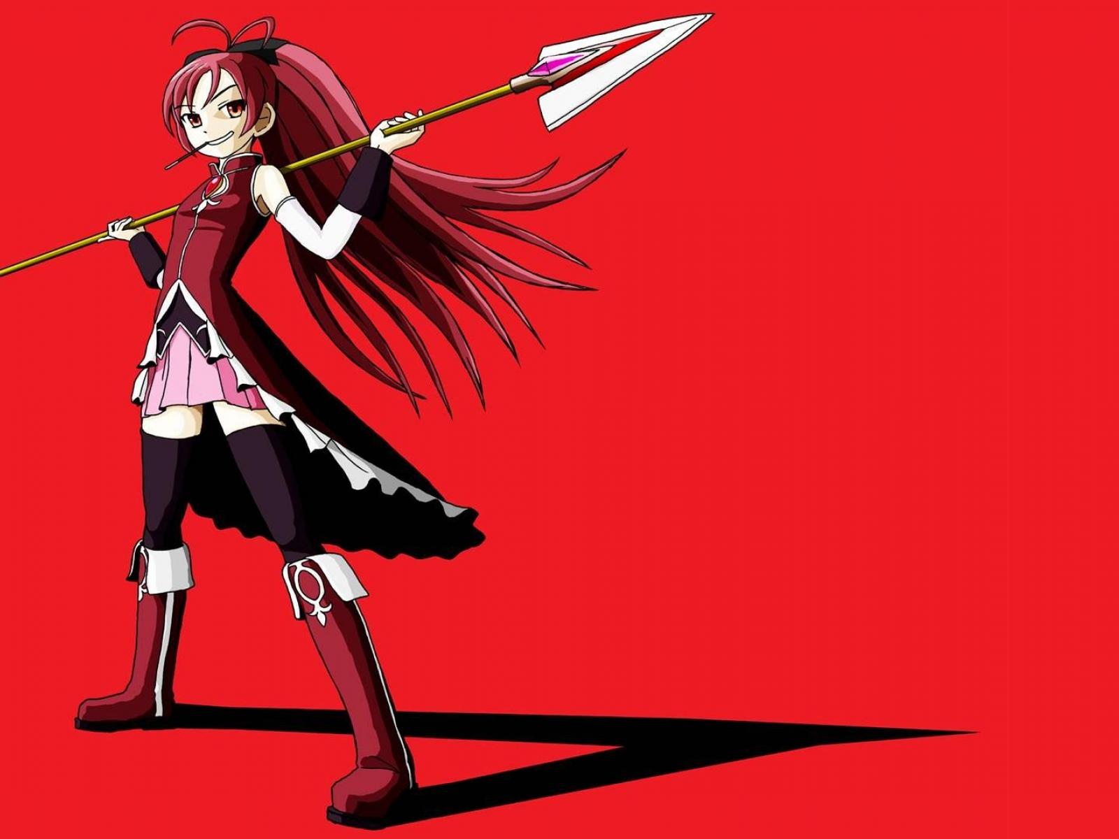 Wallpaper Girl with a spear on a red background, girl fairy Madoka