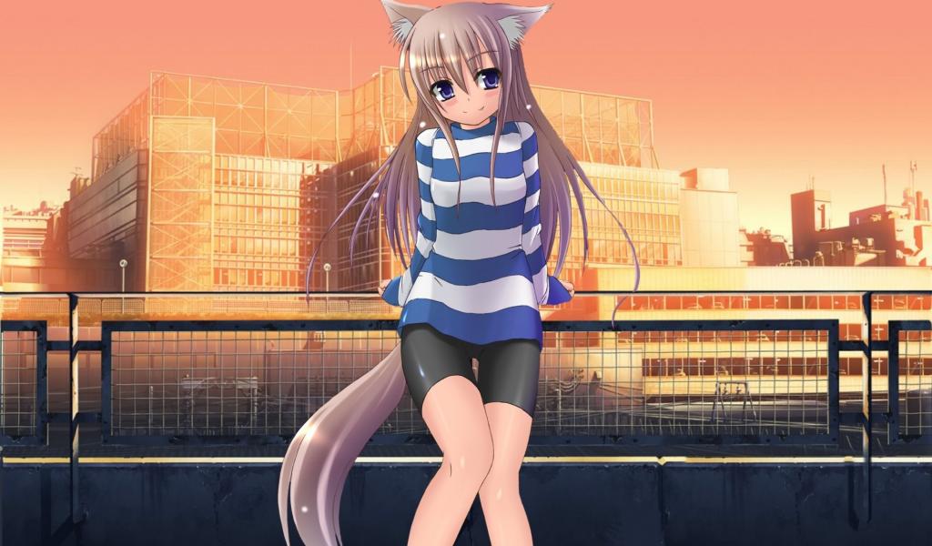 Wallpaper Girl cat on a background of buildings, anime