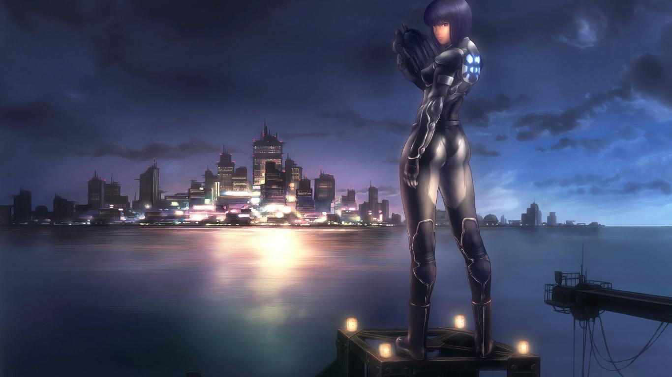 Wallpaper The girl on the background of the city in the anime Ghost in the Shell