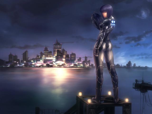 Wallpaper The girl on the background of the city in the anime Ghost in the Shell