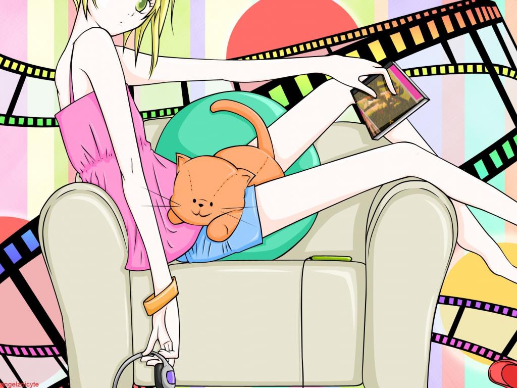 Wallpaper Anime girl with red cat on her lap