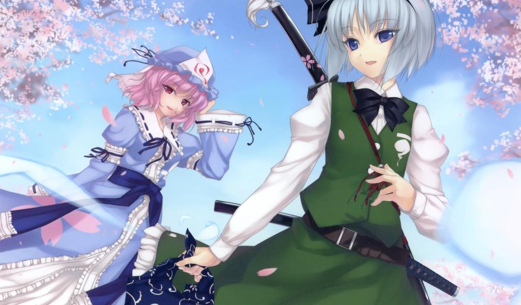 Wallpaper A couple of girls under an umbrella in the anime Saigyouji Yuyuko