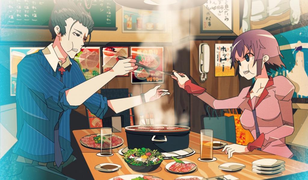 Wallpaper Man and woman at a table in the anime Monogatari Series