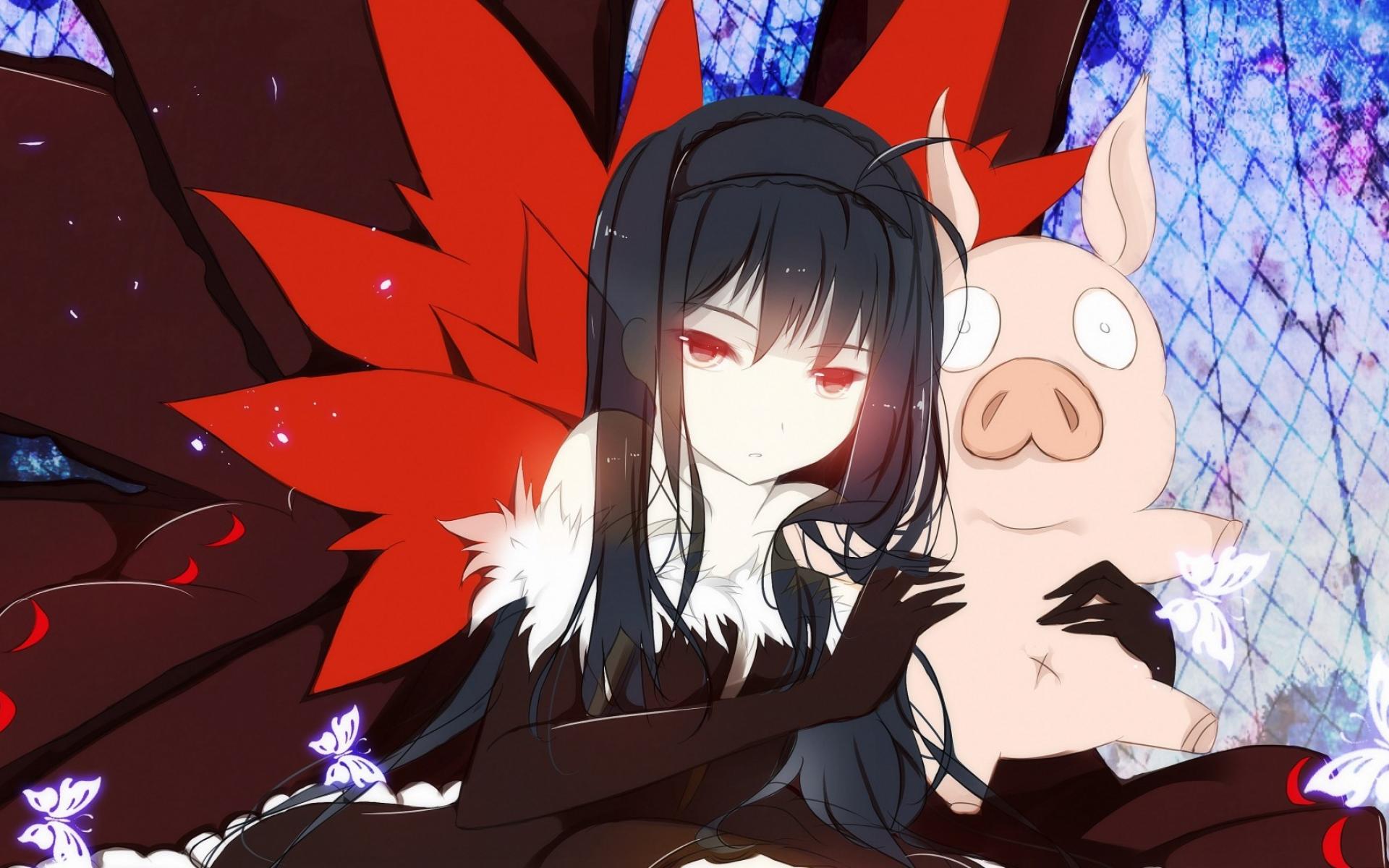 Wallpaper Anime girl with a pig