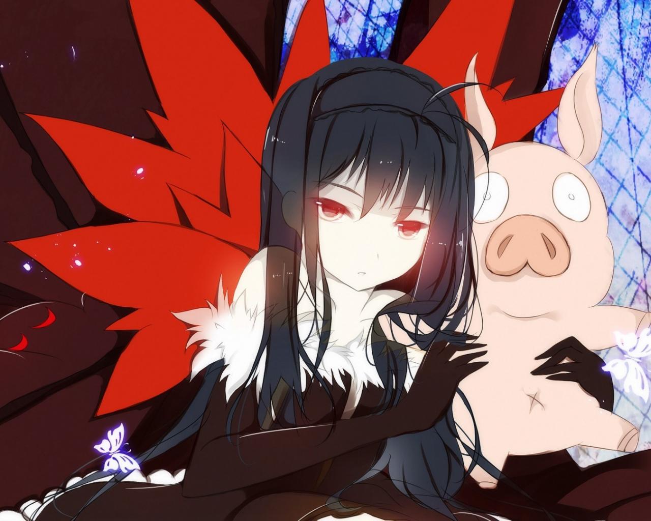 Wallpaper Anime girl with a pig