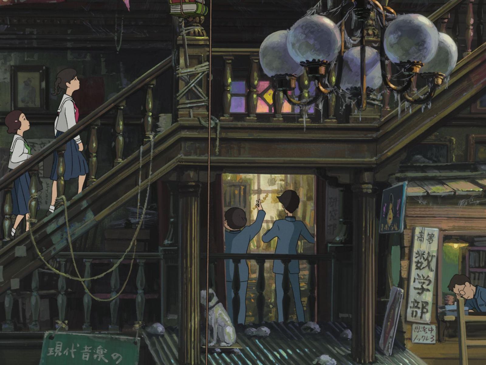 Wallpaper Miyazaki`s anime cartoon, girls up the stairs