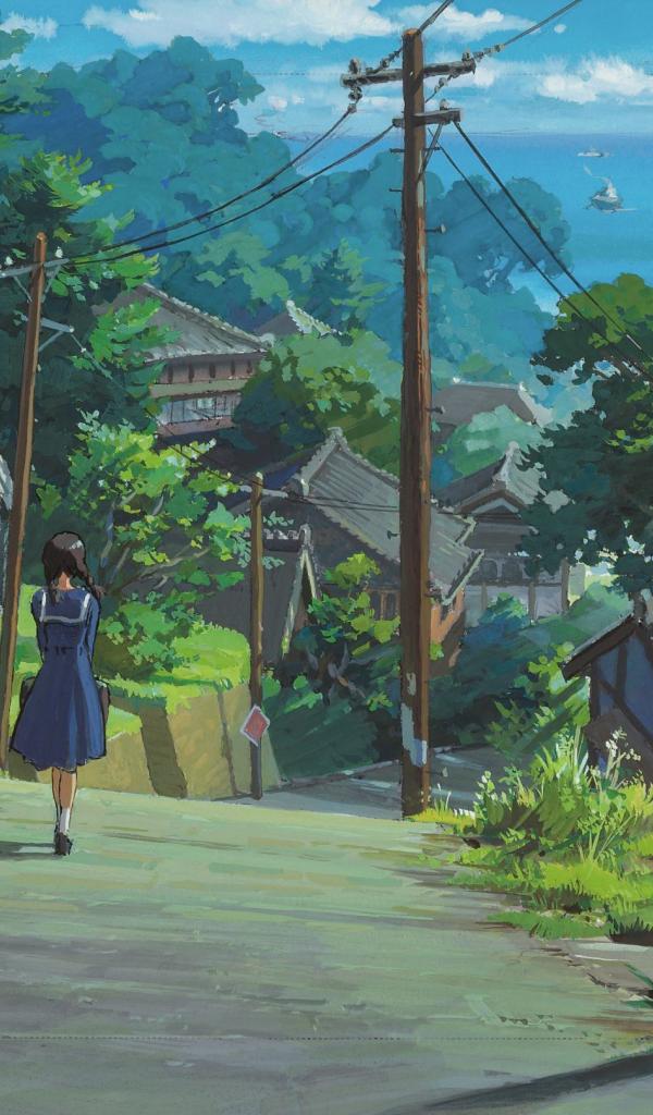 Wallpaper Miyazaki`s anime cartoon, girl walking along the road