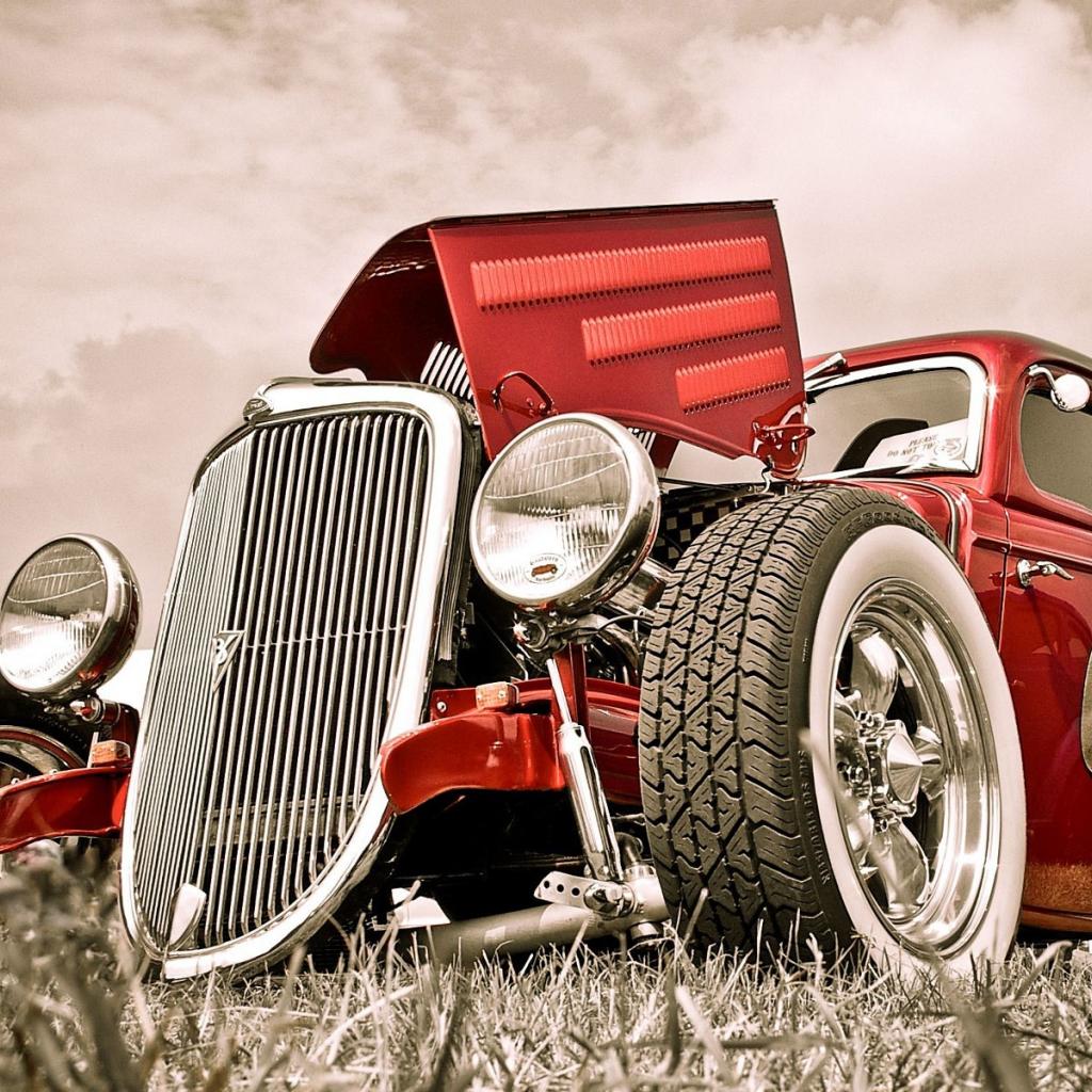 Wallpaper Red retro car with open hood