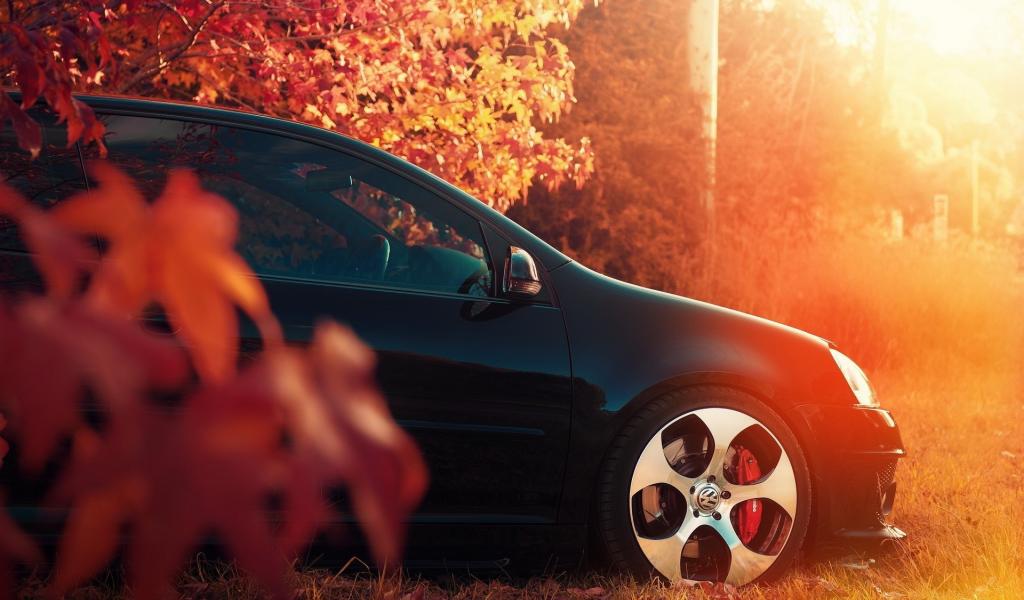 Wallpaper Black car under the autumn leaves