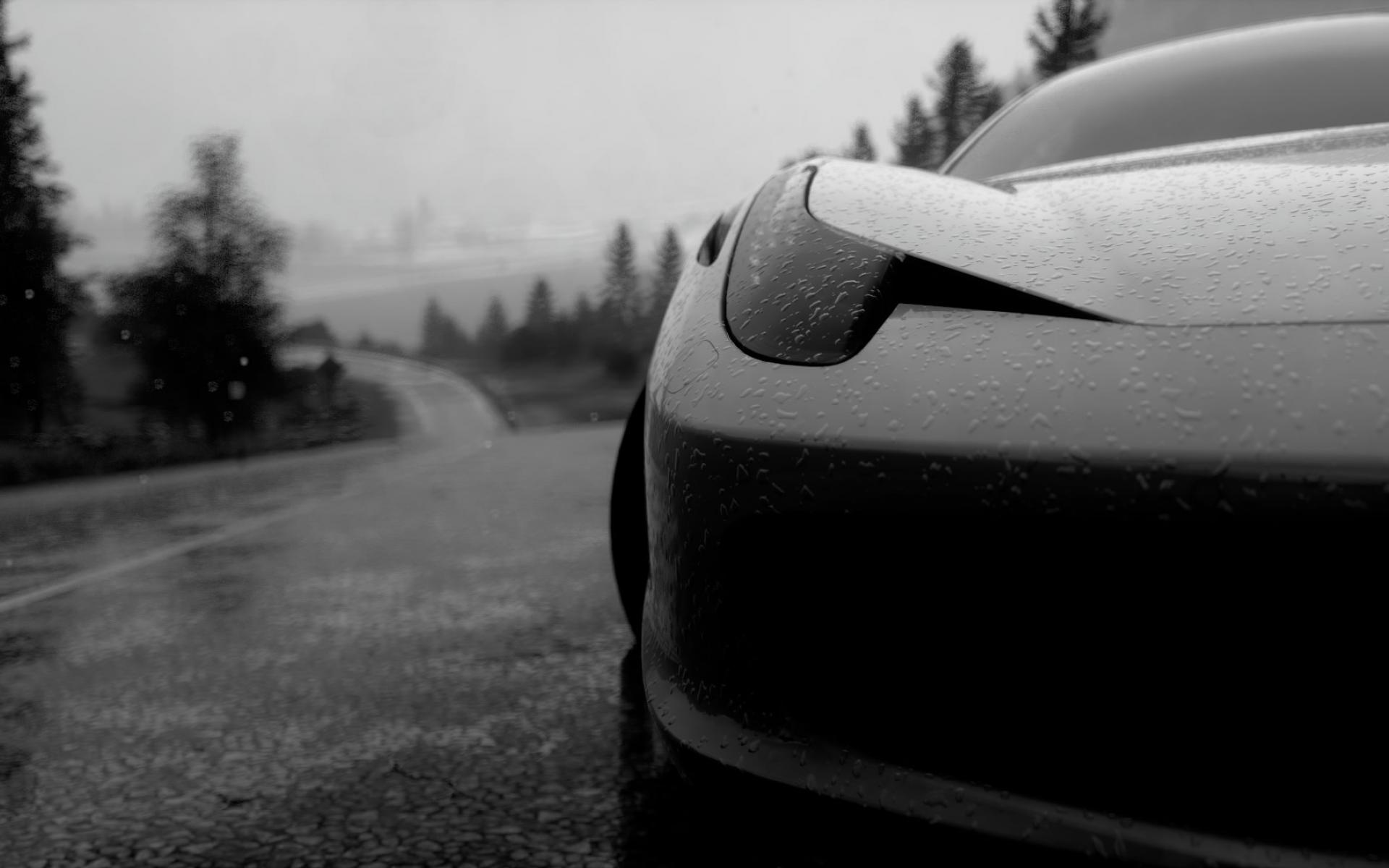 Wallpaper Black and white photo of a car in the rain