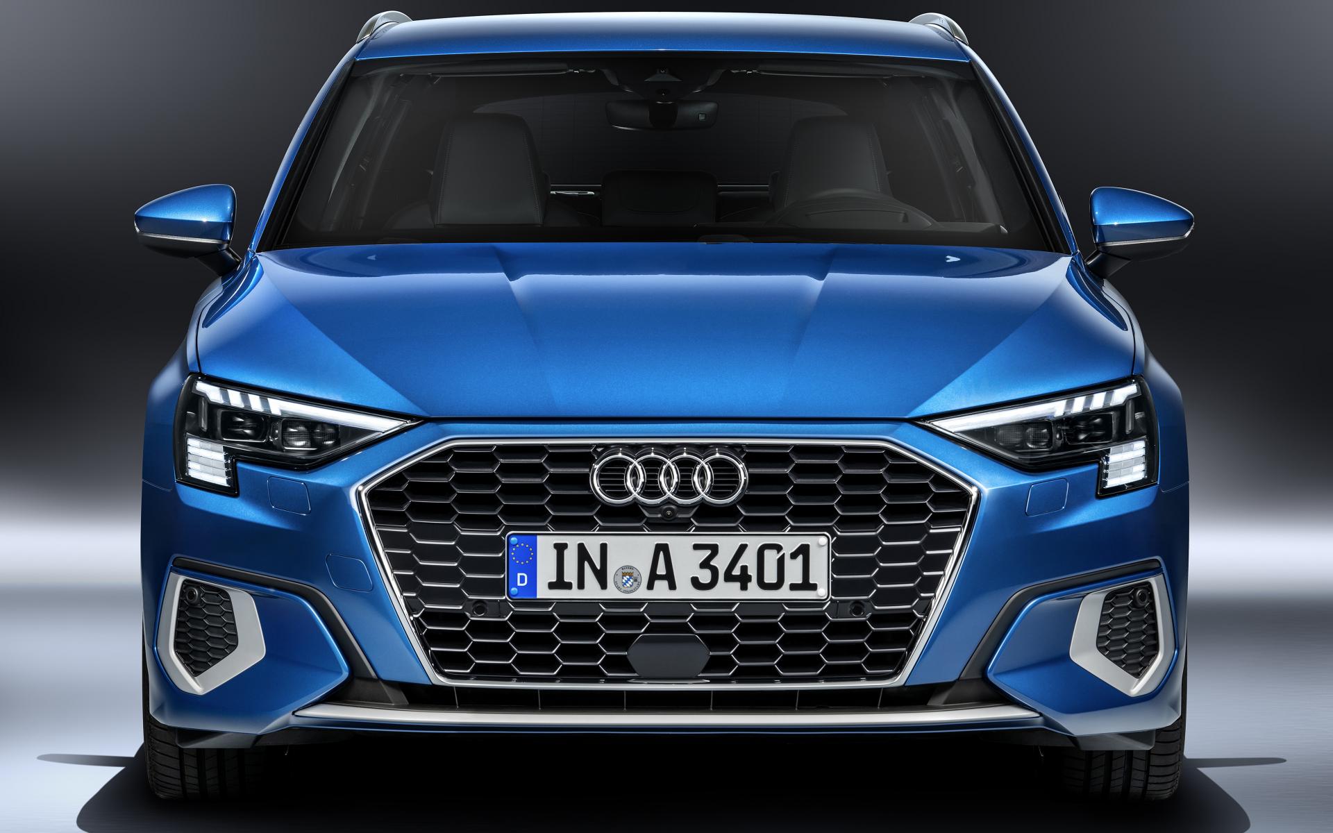 Wallpaper Blue car Audi A3 Sportback 35 TFSI 2020 on a gray background