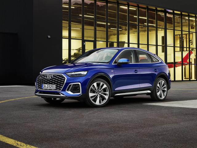 Wallpaper 2021 Audi TTS car in front of a building with large windows