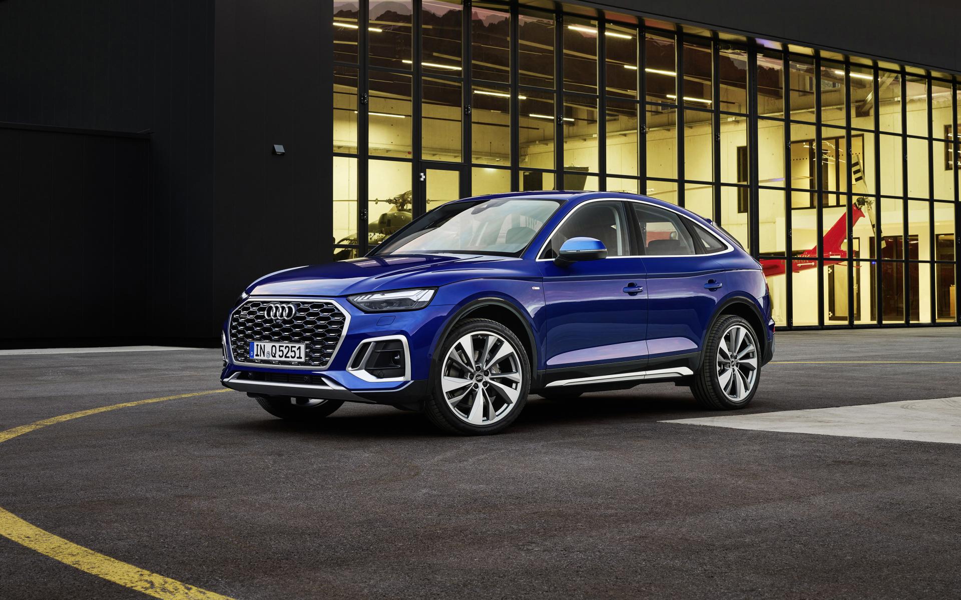 Wallpaper 2021 Audi TTS car in front of a building with large windows