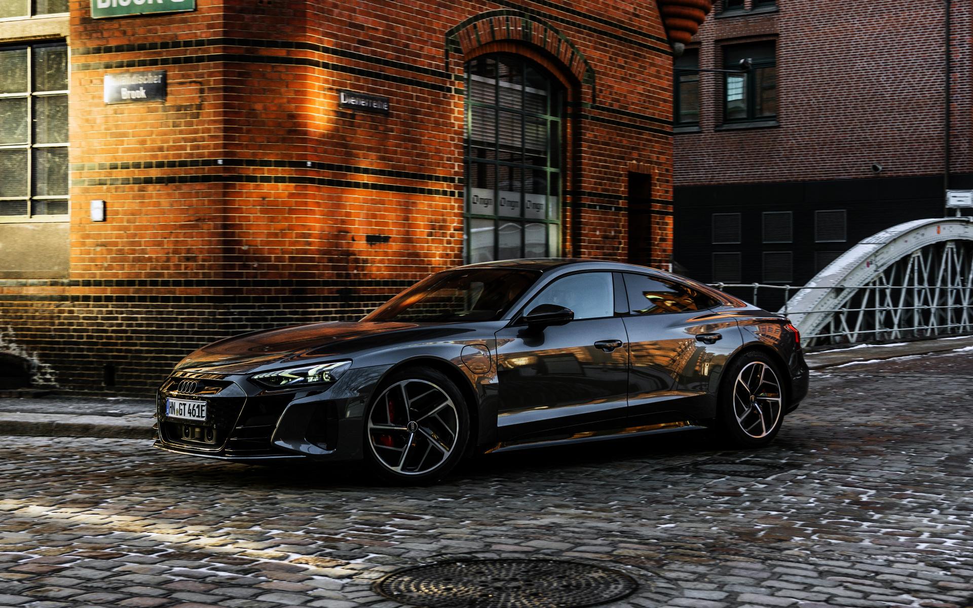 Wallpaper 2021 Audi RS E-Tron GT black car in front of the building