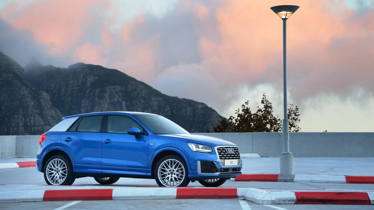 Wallpaper Blue car Audi Q2, 2017 amid the mountains