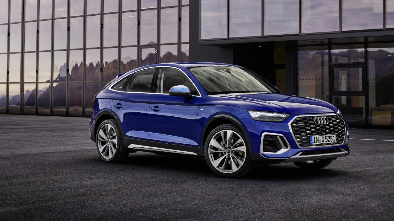 Wallpaper Blue car Audi Q5, 2021 in front of the building