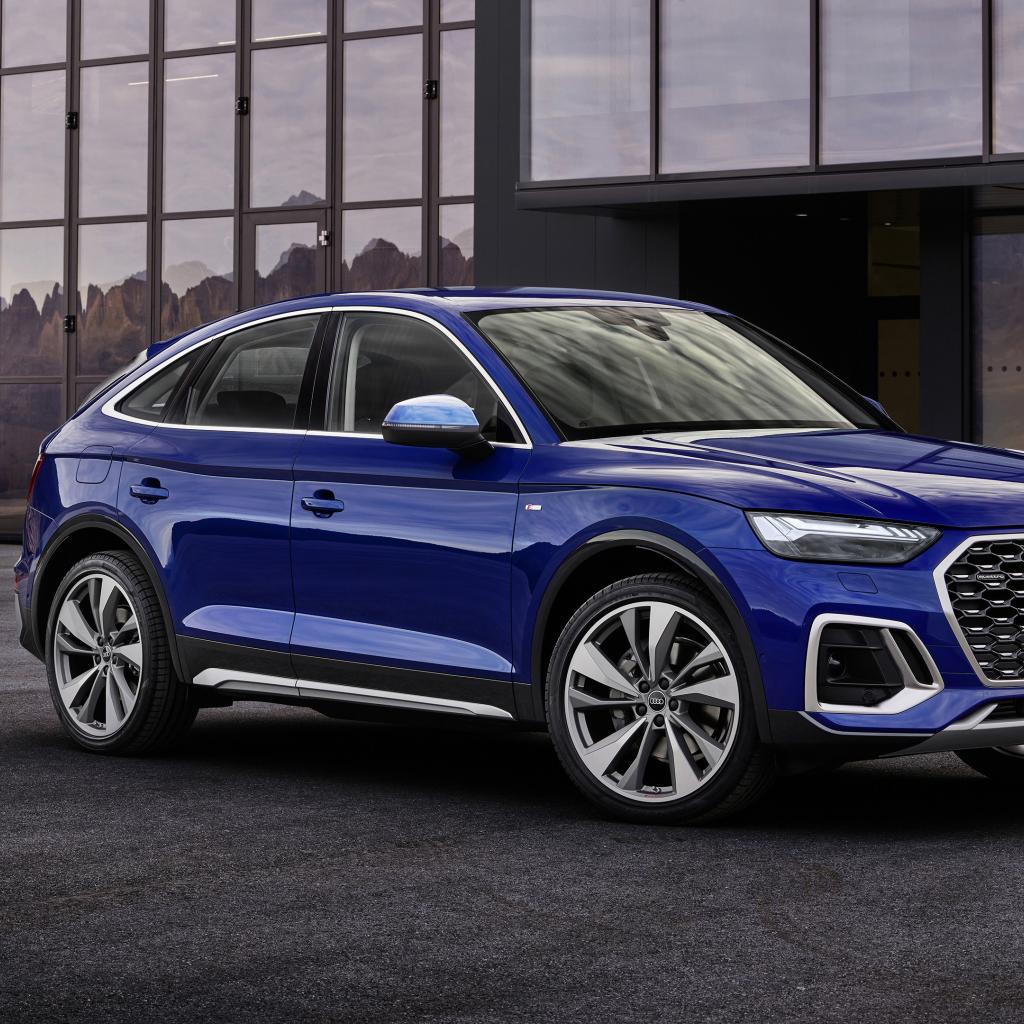 Wallpaper Blue car Audi Q5, 2021 in front of the building