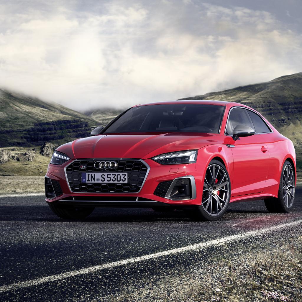Wallpaper Stylish red Audi S5 Coupe TDI 2019 on a background of hills