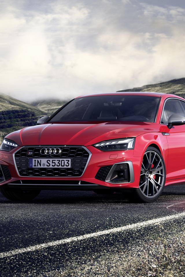 Wallpaper Stylish red Audi S5 Coupe TDI 2019 on a background of hills