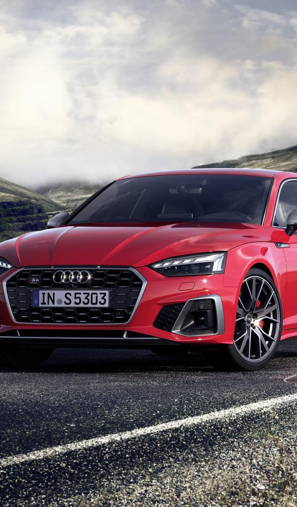 Wallpaper Stylish red Audi S5 Coupe TDI 2019 on a background of hills