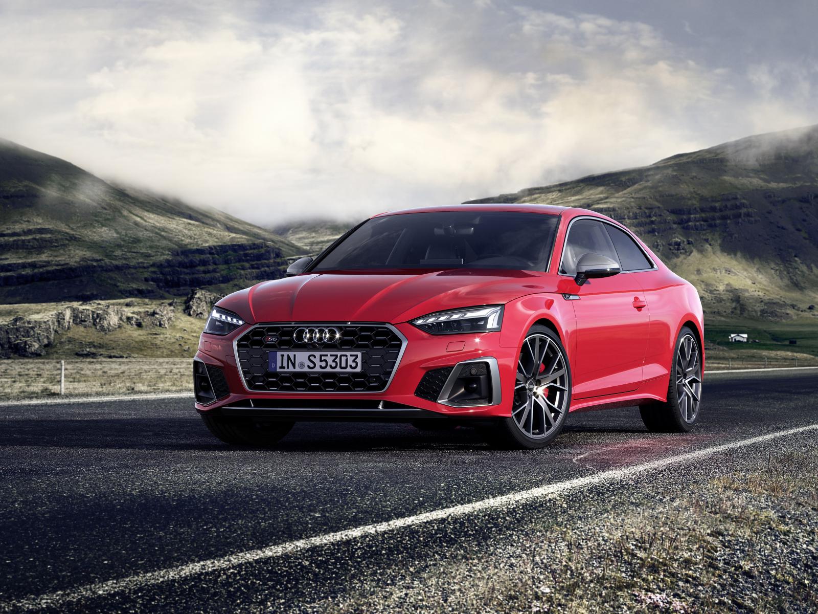 Wallpaper Stylish red Audi S5 Coupe TDI 2019 on a background of hills
