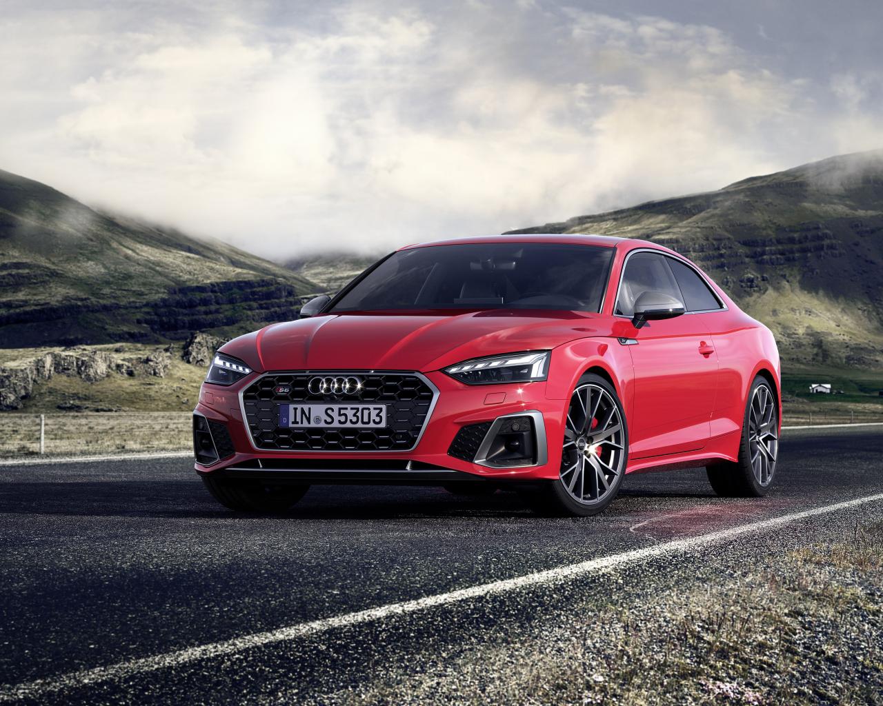 Wallpaper Stylish red Audi S5 Coupe TDI 2019 on a background of hills