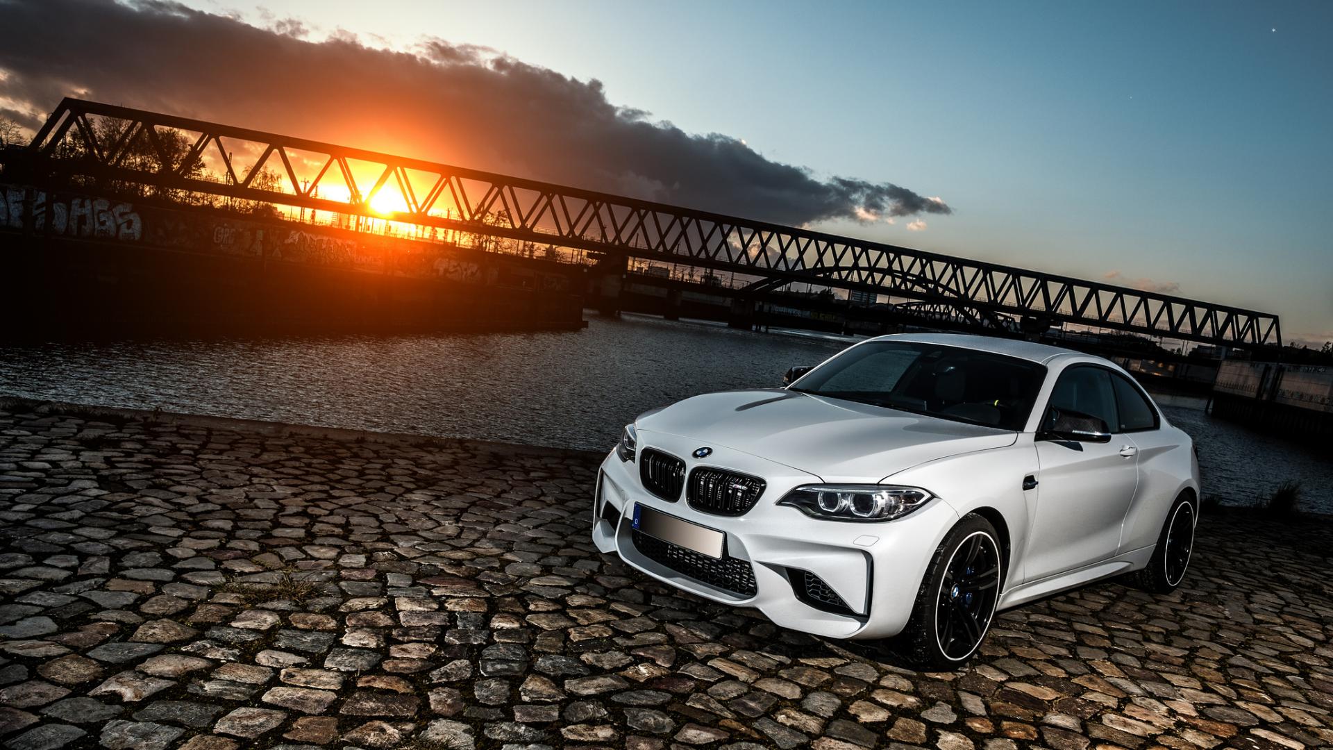 Wallpaper White BMW M2 car on sunset background