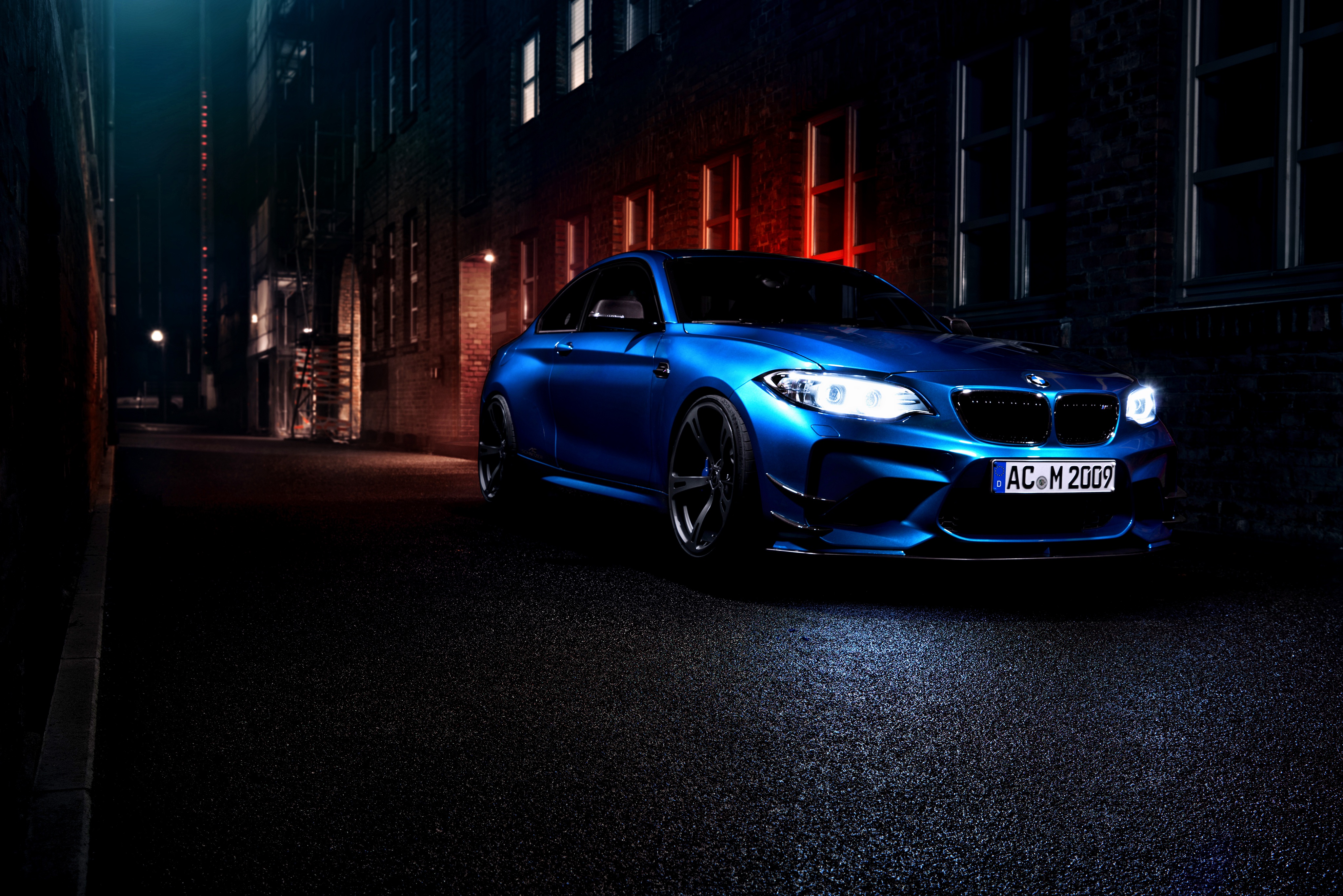 Wallpaper Blue BMW M2 car on city street at night