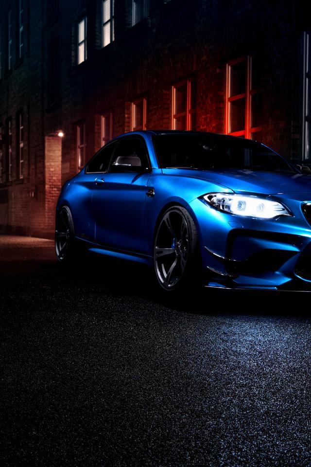 Wallpaper Blue BMW M2 car on city street at night