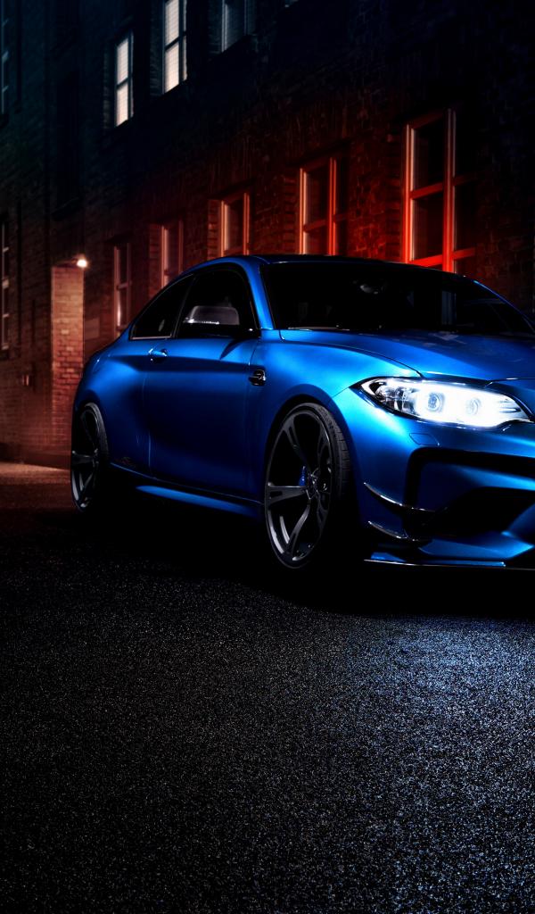 Wallpaper Blue BMW M2 car on city street at night