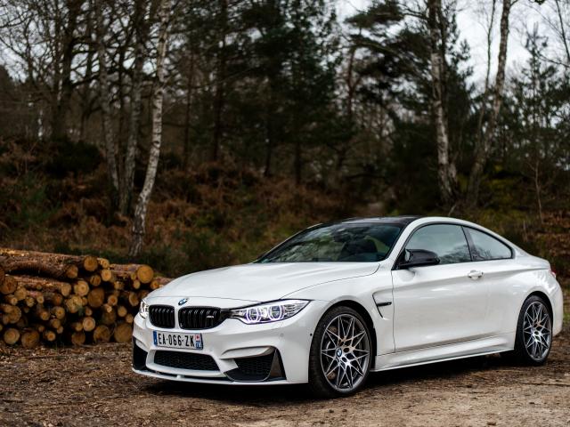 Wallpaper White stylish BMW M4 car on the background of trees