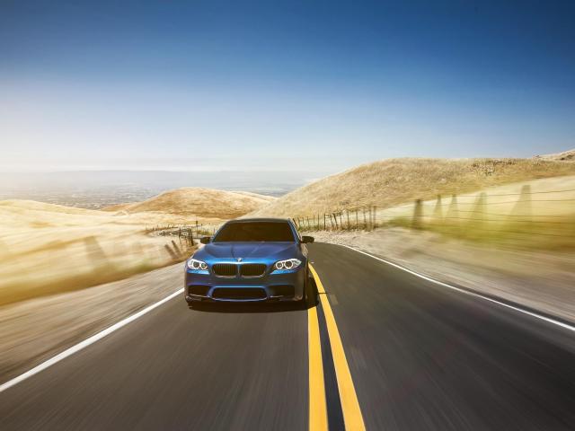 Wallpaper Blue BMW racing on a highway in the desert