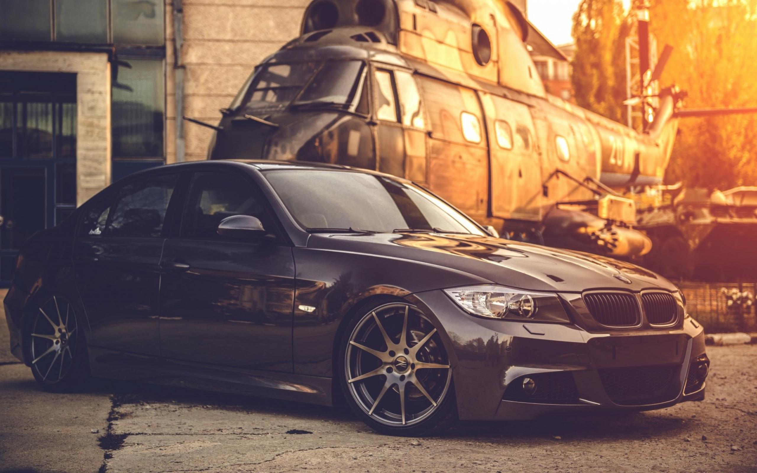 Wallpaper Black BMW against the backdrop of a helicopter