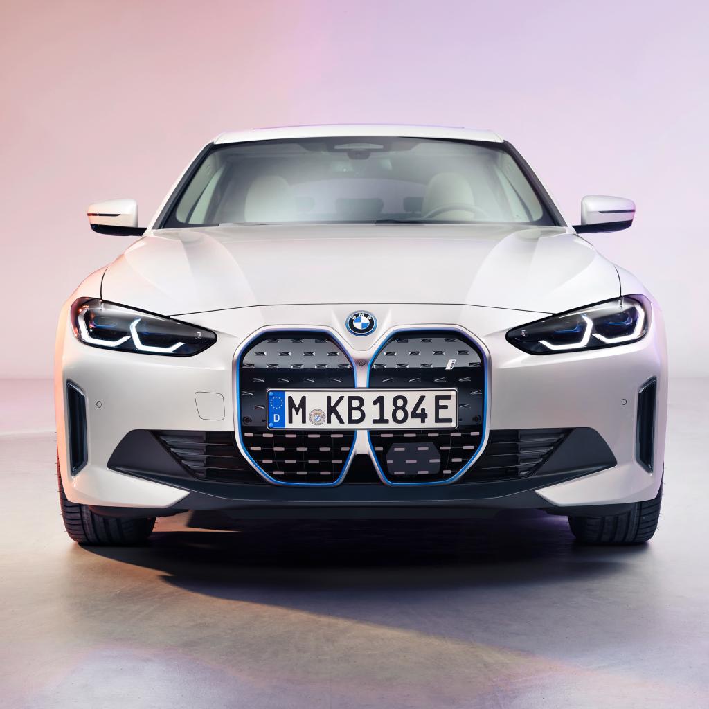 Wallpaper 2021 BMW I4 car front view on pink background