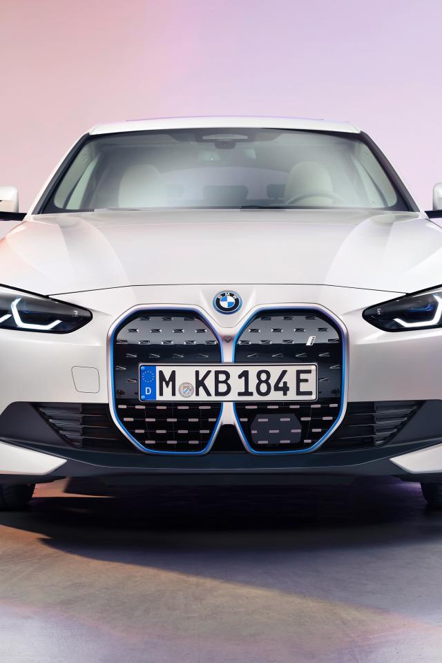 Wallpaper 2021 BMW I4 car front view on pink background
