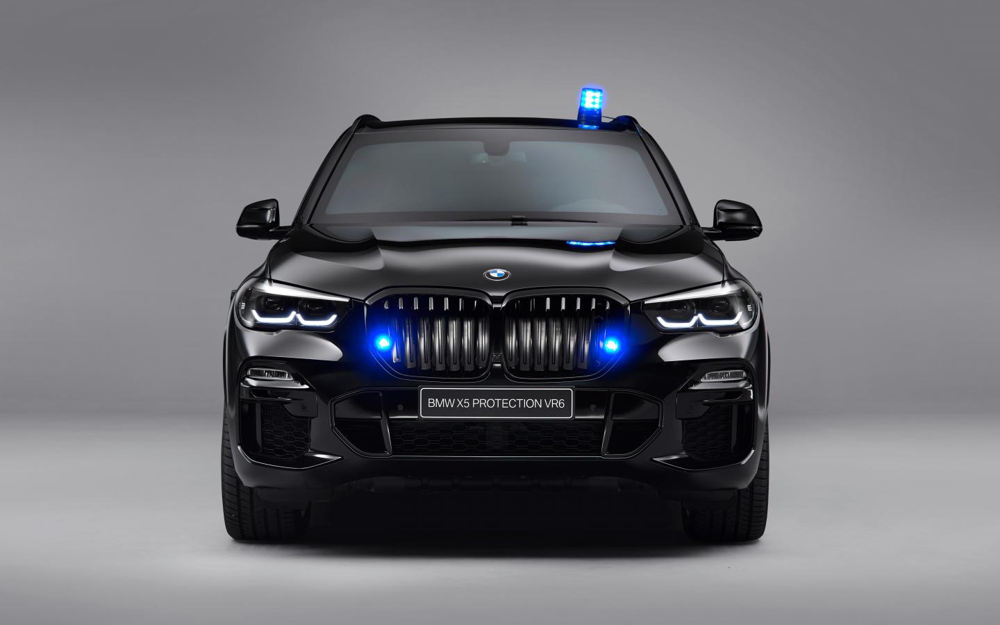 Wallpaper Black car BMW X5 Protection VR6 2019 on a gray background front view
