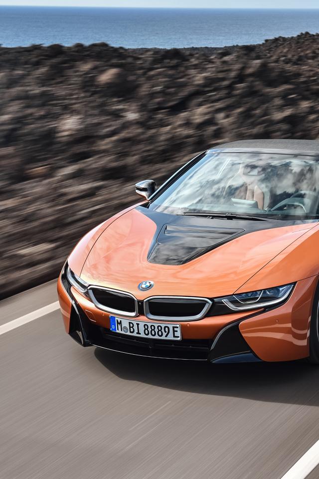 Wallpaper Orange car BMW i8 Roadster, 2018 at speed