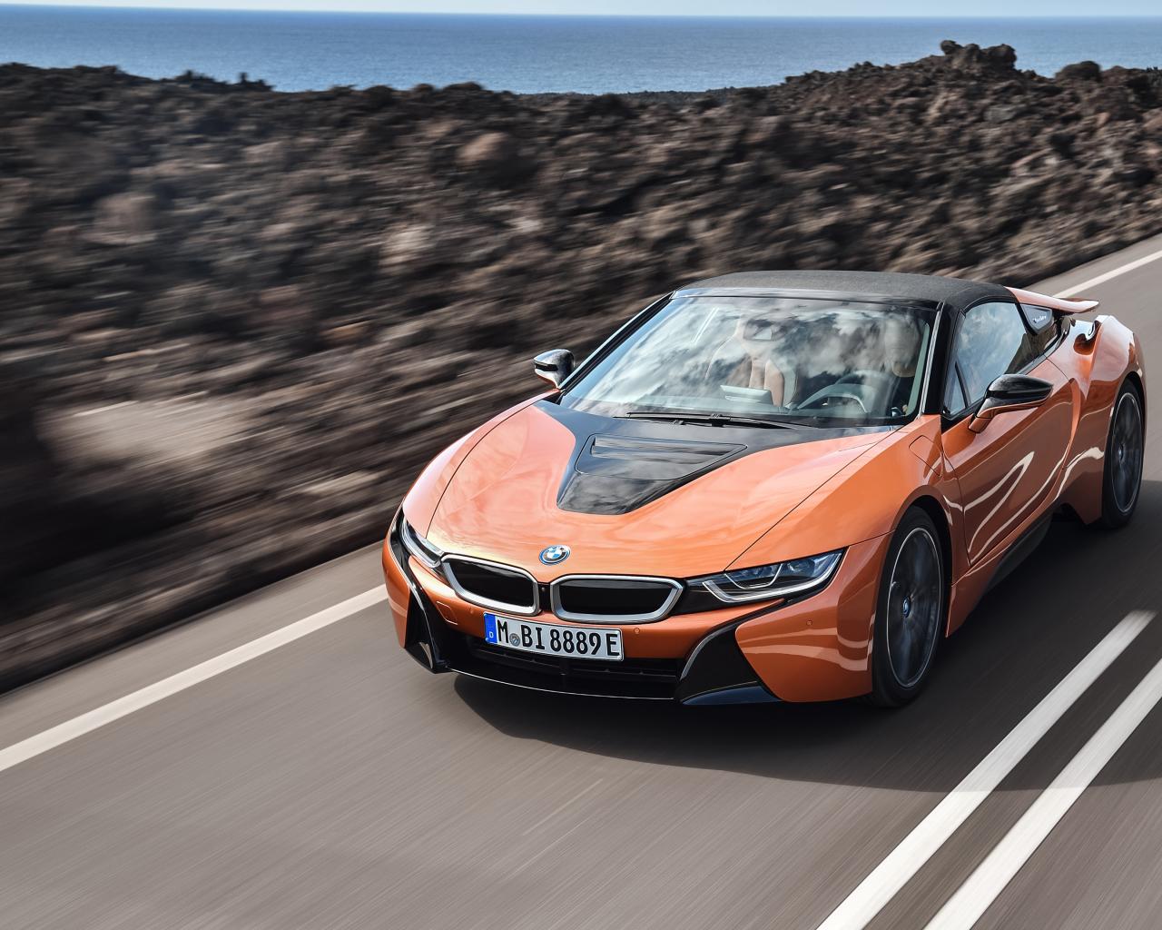 Wallpaper Orange car BMW i8 Roadster, 2018 at speed